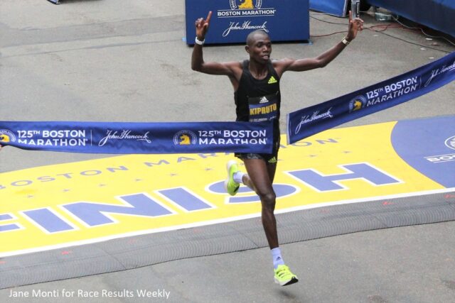 PHOTO: Benson Kipruto of Kenya winning the 2021 Boston Marathon (photo by Jane Monti for Race Results Weekly)